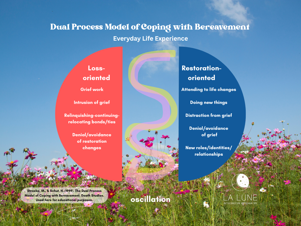 The Dual Process Model of Coping with Bereavement (Stroebe & Schut, 1999) explains that healthy grieving involves oscillating between two modes: